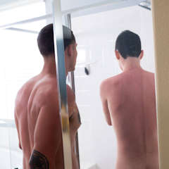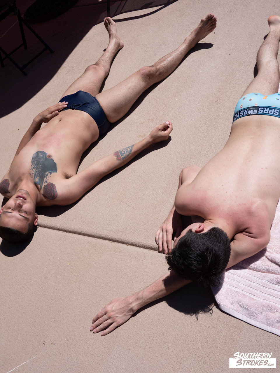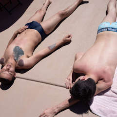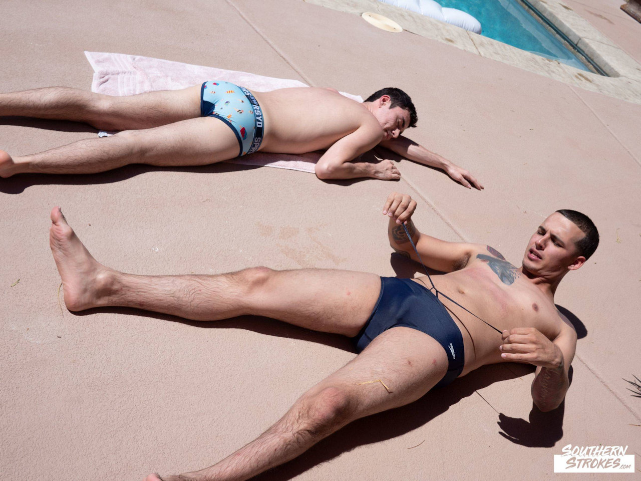 | While hanging out with their friends, soaking up some rays and enjoying the swimming pool, Bentley Layne and Xavier Ryan explore their budding relationship with innocent hand holding and staring deeply into each others eyes. Then they take it a step further. No, they don't have sex. Not exactly. Yes, Xavier Ryan is naked, and in bed, but getting a sensual massage. Intimate and erotic, the hunky tattooed young stud rubs himself all over Xavier, both of them relishing the sensation, the touch. From time to time they go a bit further -- Bentley plays with Xavier's cock, Xavier sucks Bentley a bit, the two rub their cocks against each other -- but this is all about being playful. It's about how much control you have over your new boyfriend. It's about pushing to see how far you can go before nature takes over to satisfy your lust. And after Bentley's helping hands, lucky Xavier enjoys an expert handjob, spraying a load of thick cum all over his belly before hitting the shower to clean up together.